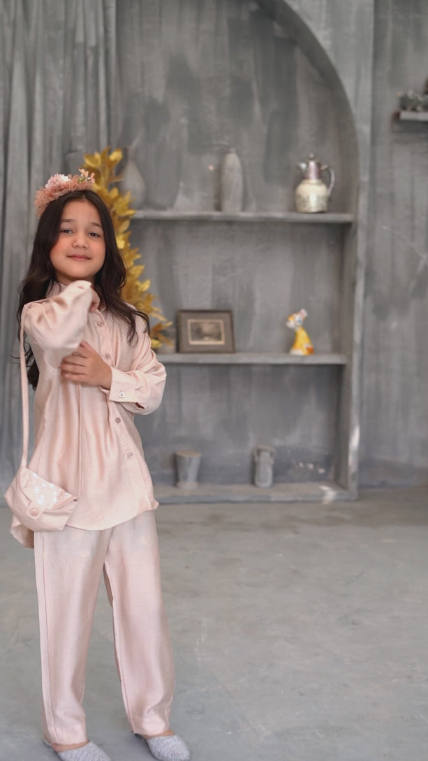 This 2-piece article has; cuffed sleeves, buttons down shirt with small crossbody bag accessory on which handwork (adda) is done using; cutdaana and pearls. Paired with straight pants.