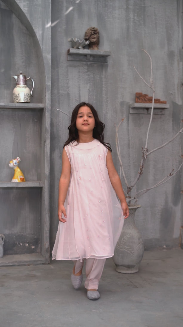 This 2-piece article; inner chiffon frock with gathers and an upper layer with adjustable strings on the side; the upper layer has handwork (adda) work on it using; beads and flower shaped sequins. Paired with straight pants.