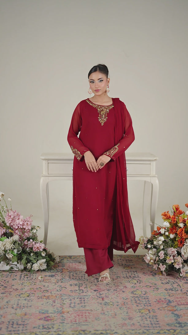3-Piece Stitched Sophisticated Maroon Hand Embroidered