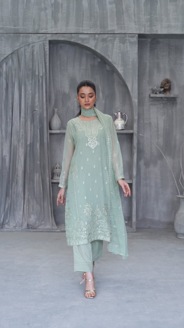 3-Piece Stitched Traditional Pista Gree Embroidered
